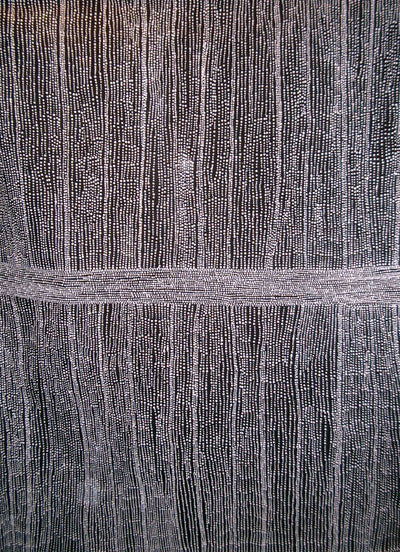 Dorothy began painting in 1987. Initially she painted Mukaki, Bush or Wild Plum Dreaming in vibrant colours, but now focuses on painting her country, Mina Mina, using a more subdued palette relying on contrast to draw attention to the elaborate interlocking patterns.