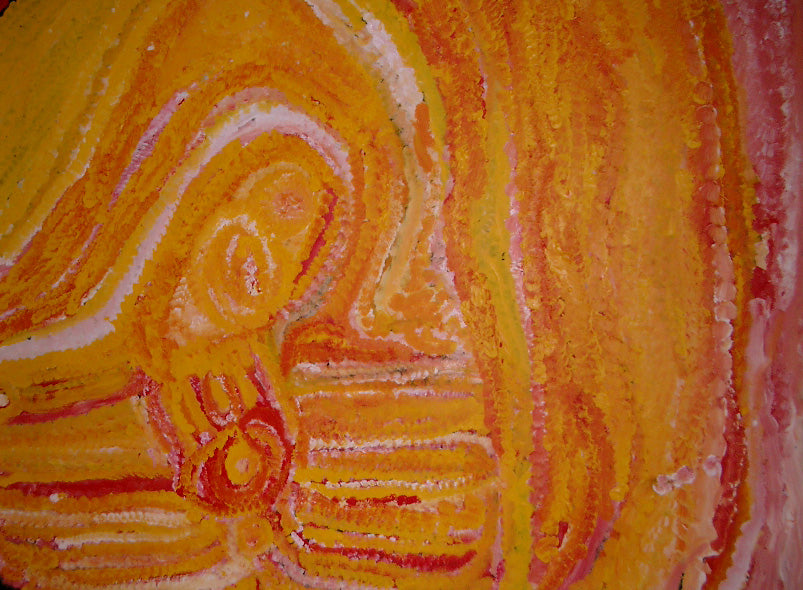 Eubena is held in high esteem by her peers for her importance in matters of tradition and ceremony as well as for the quality of the art that she produces. Her work is very feminine, mostly using pinks, reds, yellows and oranges, with flowing lines and brush work that create a great sense of movement and energy in the work.