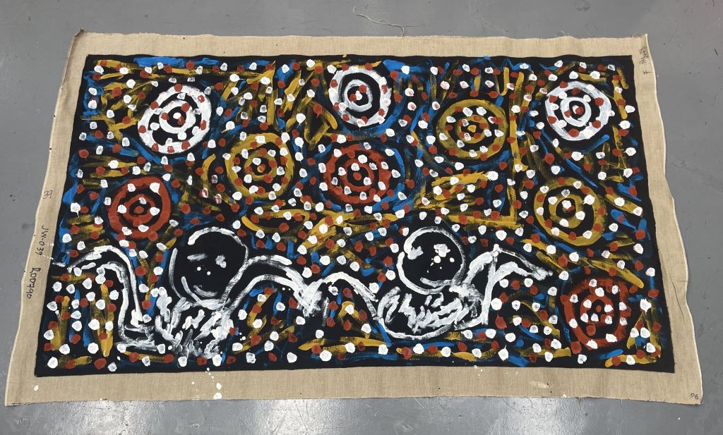 His work is imbued with an incredible sense of movement and ceremony that can only be understood through experiencing his paintings in the flesh. Geoffery Bardon the initiator of the acrylic movement fondly recollected that Johnny would paint with intense level of intuitive concentration. The body of work that Johnny has left behind contains some of the finest examples of not just Aboriginal, but Australian abstract painting. His work features in many public and private collections throughout the world.
