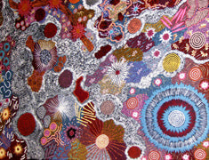 Michelle is the daughter of the highly acclaimed and arguably the most famous Aboriginal artist, Clifford Possum Tjapaltjarri. She paints Seven Sisters Dreaming, Bush Coconut, Black Seed and women‘s stories from Mount Allan. Whilst her style is reminicent of her famous and highly talented father, she applies her own innately feminine intepretation so that the resulting works are distinctively recognisable as hers. Michelle features in major collections throughout the world and continues to excite her audiences with the evolution of her style.