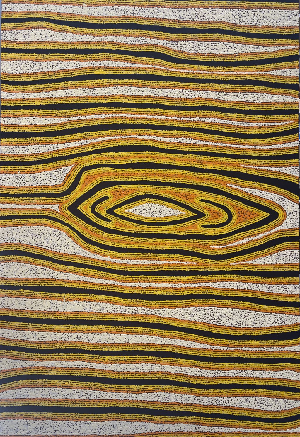 As a second generation artist Eileen learned to paint from her parents, it was not until the death of her mother in 1999 that Eileen began to paint her own stories. She has become an important figure in the contemporary Aboriginal art world, interpreting her main subject, her father's birth site, Tjitjurrulnga (also known as Titjurrulpa), a rockhole to the west of Kintore. Eileen's work is instantly recognisable, with bold, brilliant colours, great contrasts, and intricate compositions.