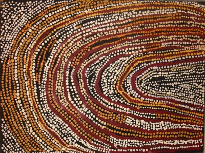 Naata's Dreamtime paintings of the Marrapinti rock hole site use a palette of orange, red, white and black to create bold and strong depictions of her Dreamings. They also combine subtle changes to create an organic quality that gives her paintings an energy of their own.