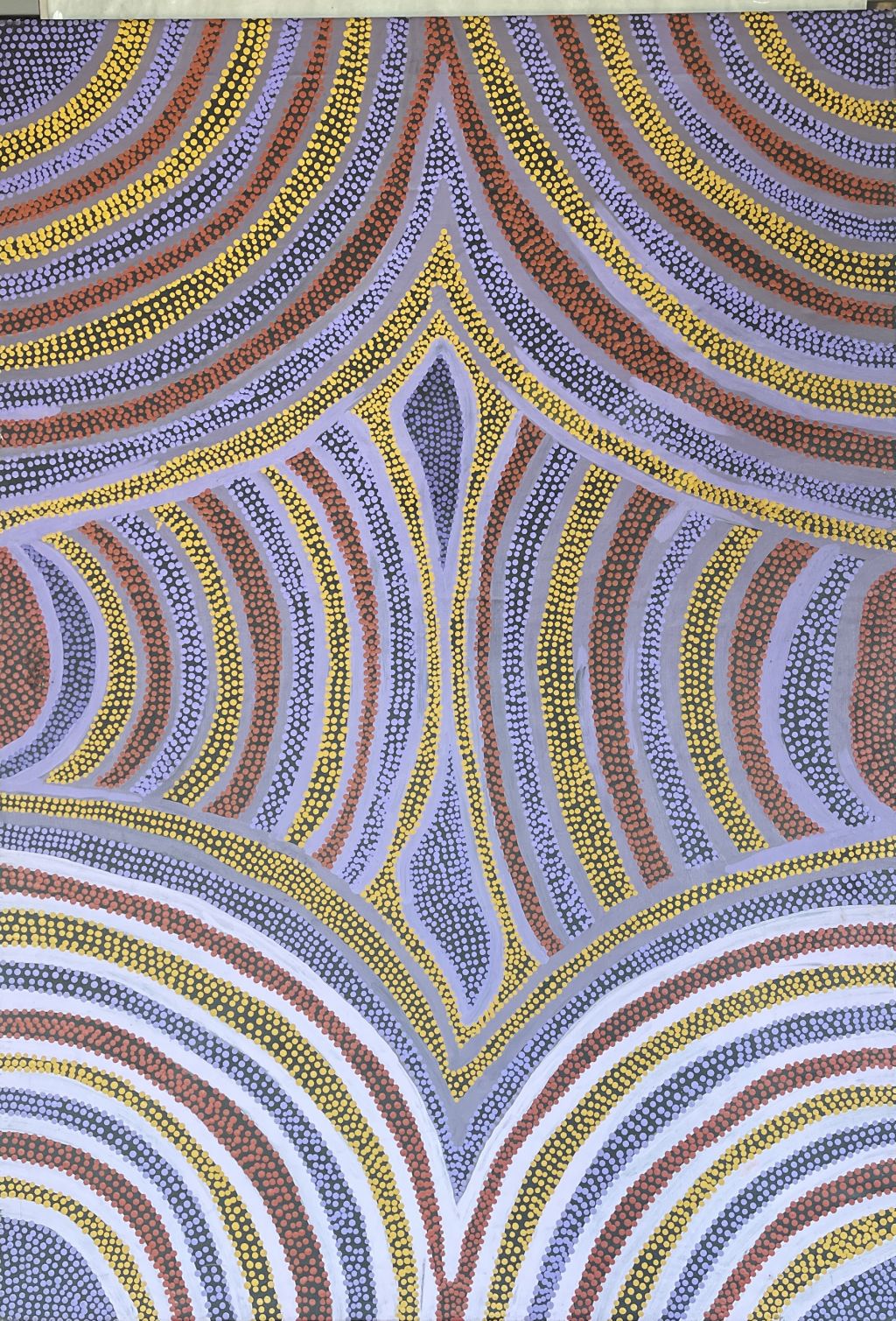 She paints Emu and Dingo Dreamings as well as women hunting, but it is her Mountain Devil Lizard for which she is best known. This Dreaming tells of the need to heed the knowledge of elders and to exist as a group rather than individuals, a topic that was of the utmost importance to the nomadic desert people. Her work has been exhibited and collected by museums and collectors worldwide.