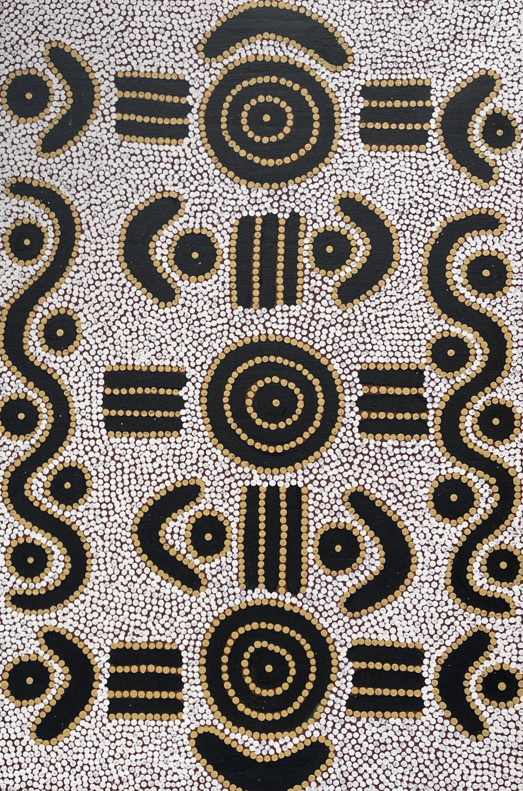 The central line represents the distinctive track made in the sand by the kangaroo's tail, with the hind legs either side. Traditionally, Kangaroo ancestors angered Warnayarra (The Rainbow Snake) at Mawarriji, a sacred site near Mt Singleton. They tried to punish the Kangaroo Men with a ferocious storm of wind, rain, and lightning. The Kangaroo Men hid in a cave for several days and waited for the storm to pass.