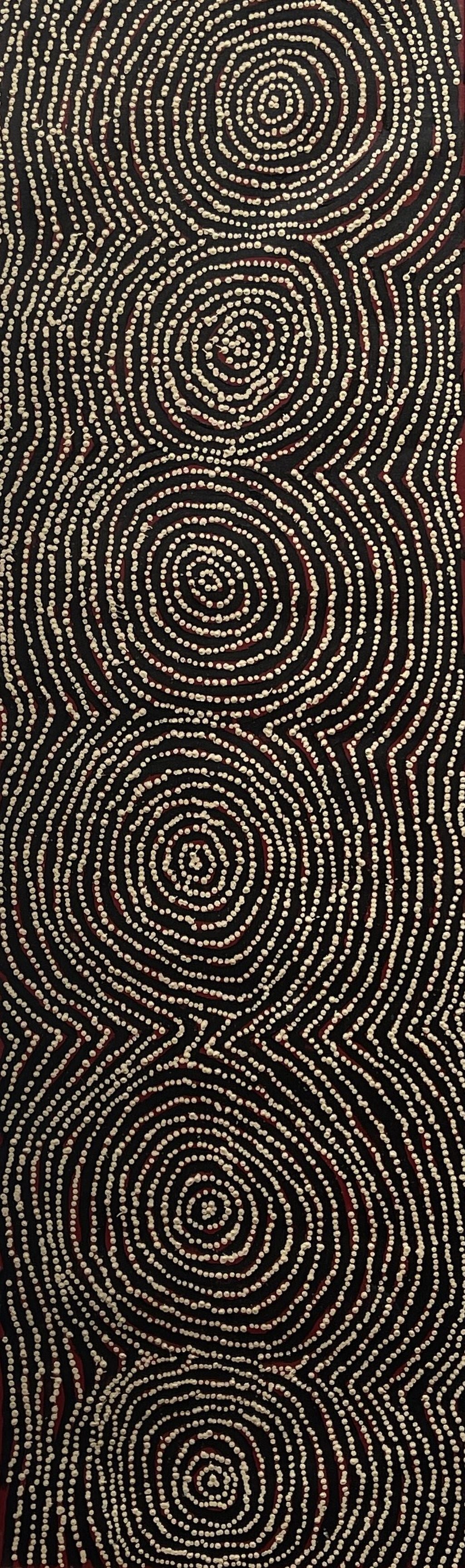 It wasn't until 1984 that he began painting with the Papunya artists. He has a distinctive, mesmeric style that depicts Dreamings of Tingari Cycle of his ancestral lands.