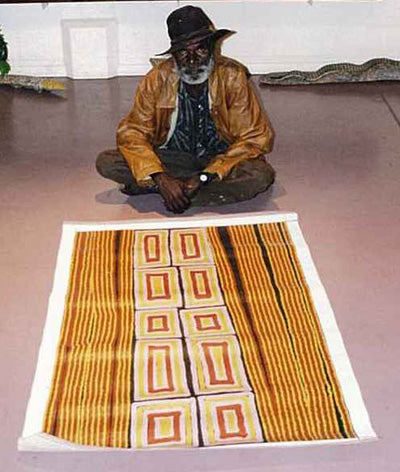 He used the influence of the older artists to develop his own unique style to interpret his Dreamings. He used arcs and hatch motifs as well as dots to hide his ancestral designs and marks from the uninitiated.