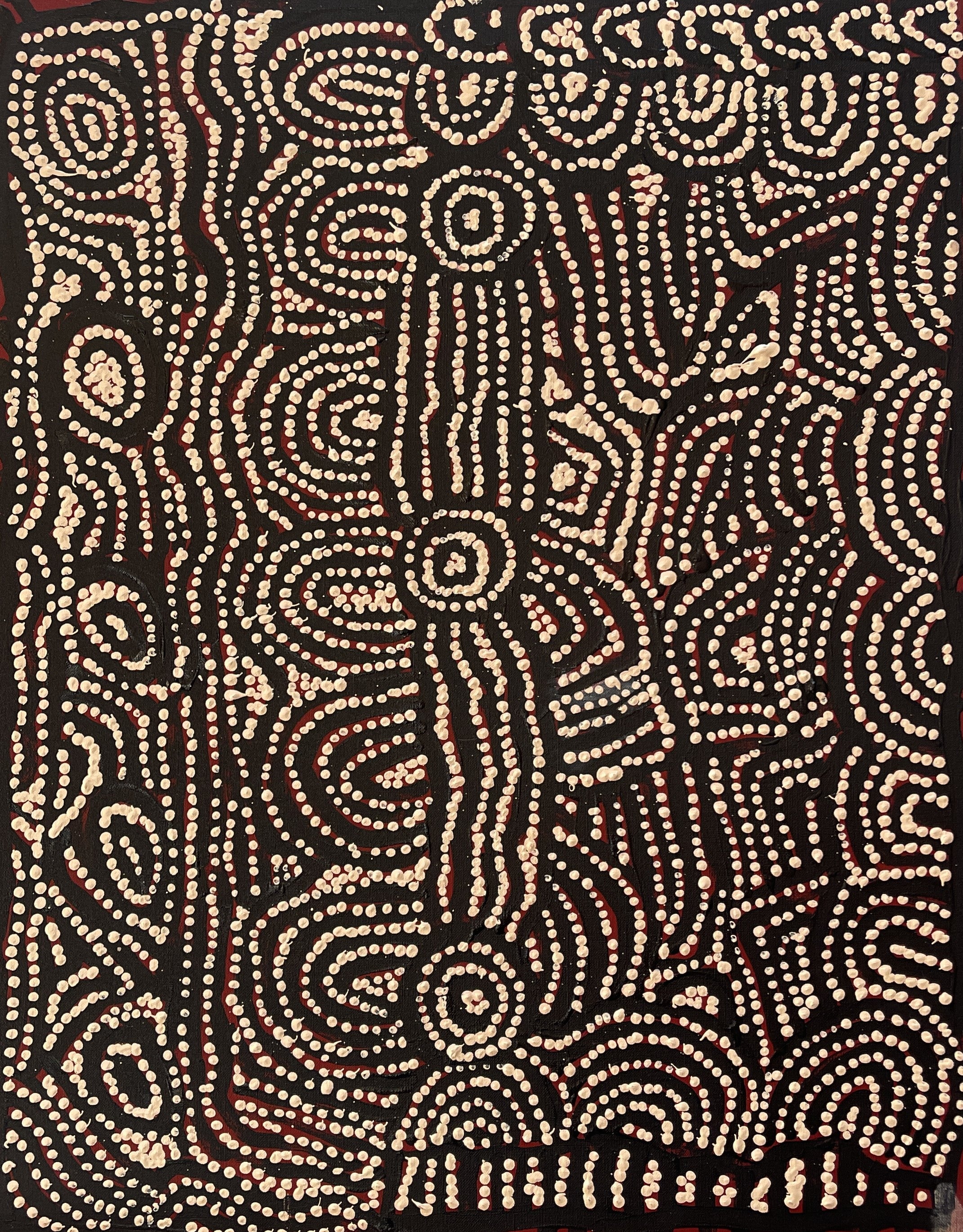 She uses traditional motifs to depict her Tjukurrpa, which are the sites associated with women's ceremonies referred to as Minyma Inmaku. The combination of traditional circular motifs and often subdued palette allows Maisey to convey the love for her country and her desire to use painting as a means to record and preserve her culture for future generations.