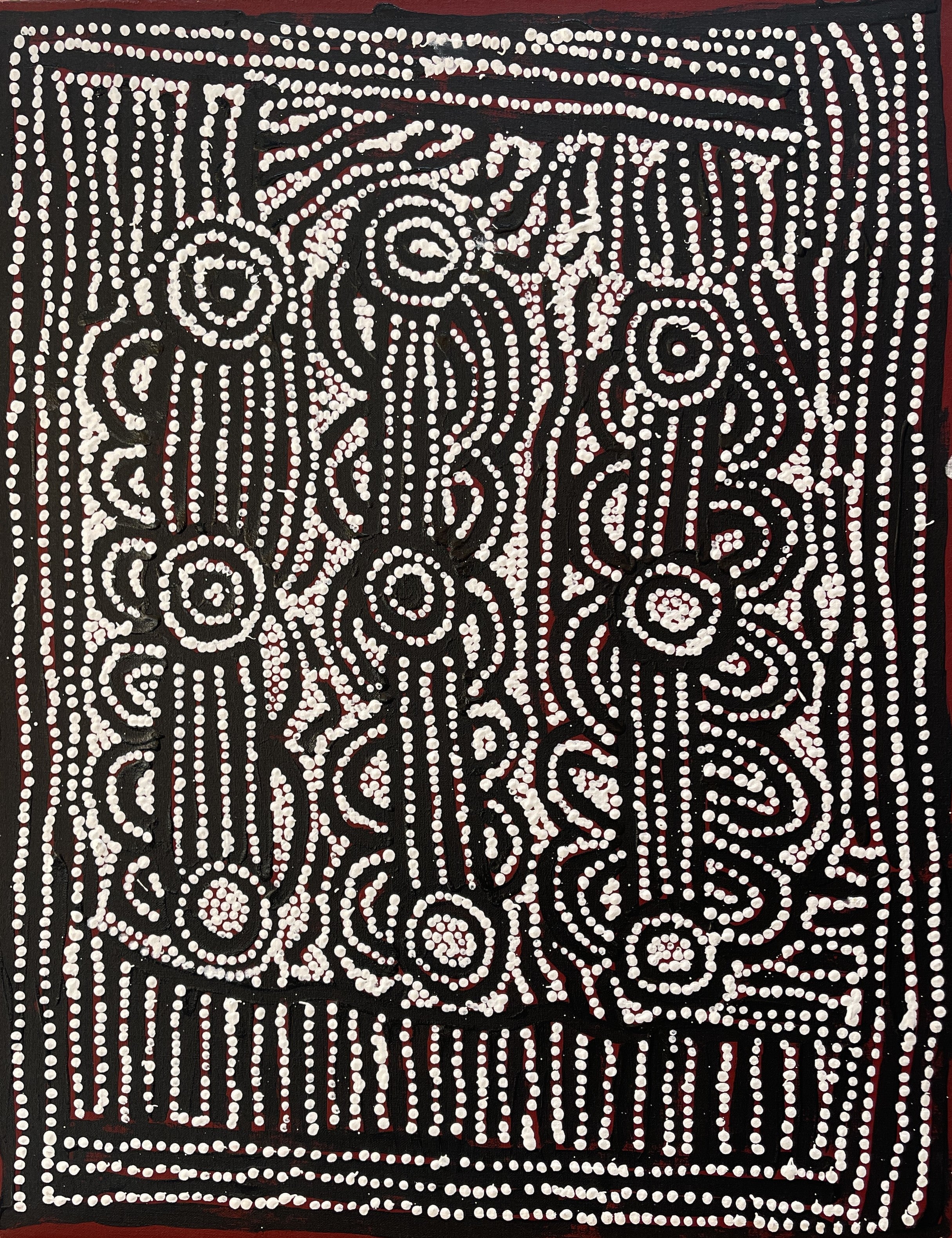 She uses traditional motifs to depict her Tjukurrpa, which are the sites associated with women's ceremonies referred to as Minyma Inmaku. The combination of traditional circular motifs and often subdued palette allows Maisey to convey the love for her country and her desire to use painting as a means to record and preserve her culture for future generations.