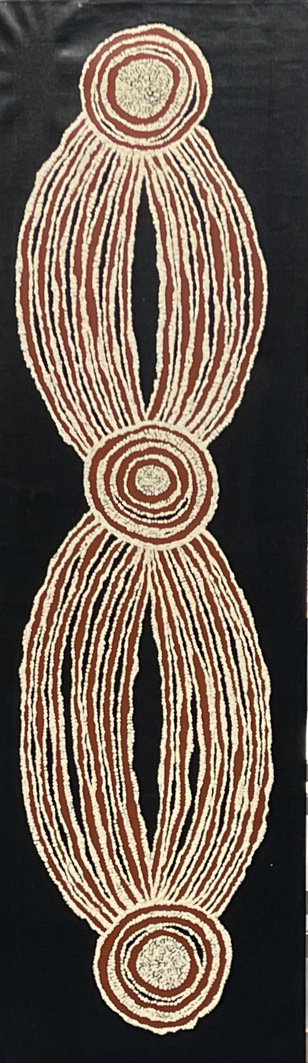 This lovely piece is part of a very impressive septych (7 combined works) by Alison Nampitjinpa Anderson is a bold and arresting work. With all 7 pieces together it's dimension are 150cm x 420cm and the effect when viewed together is as dramatic as one might expect.