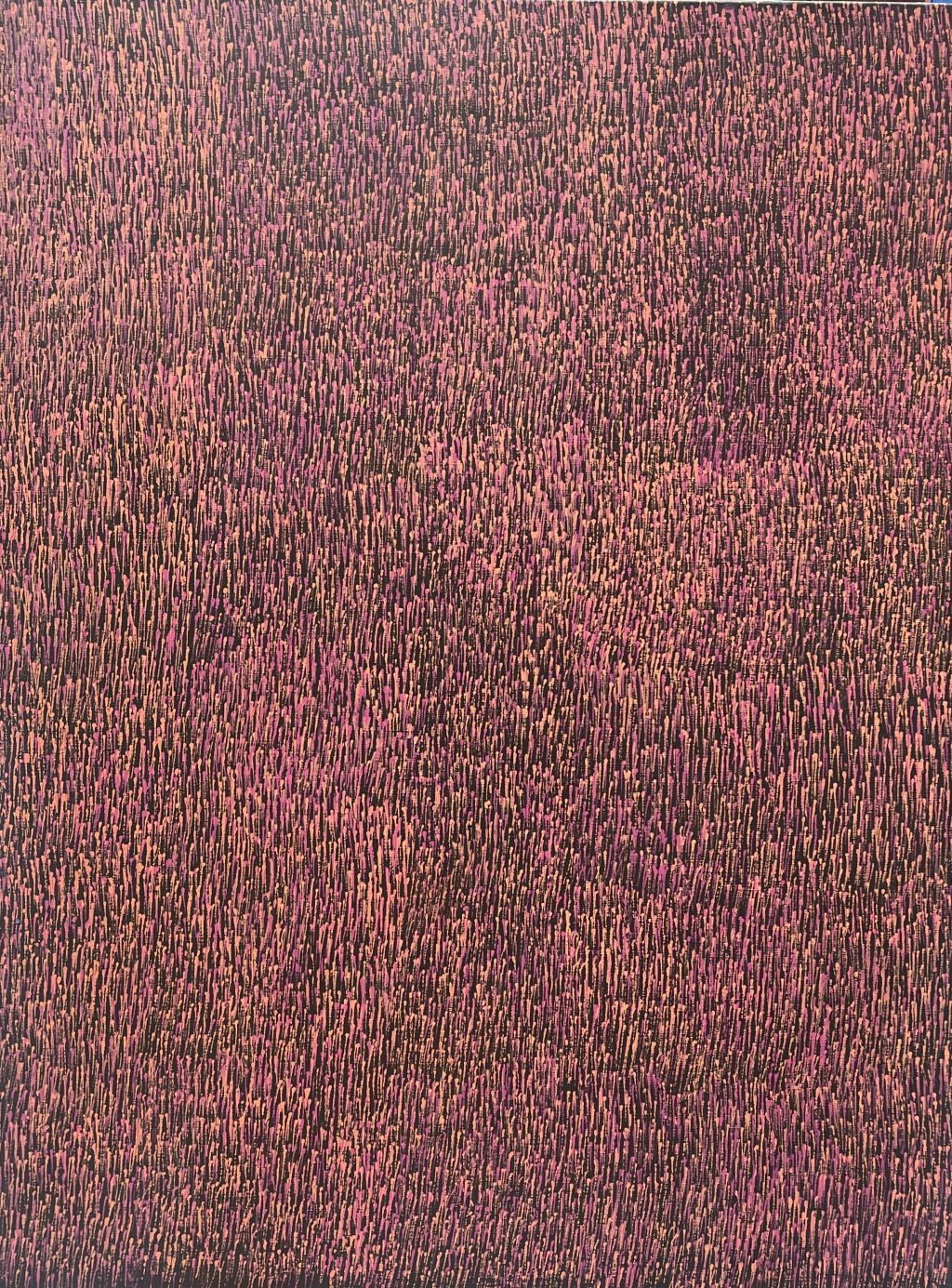 She began painting several years ago focusing on her mother and grandmother‘s Dreamings. Her work is distinct for its delicate strokes and gentle movement that is bought to life by bright colours that contrast brilliantly against stark black canvases. Her works are decorative, exciting, contemporary depictions of her family‘s traditional stories.