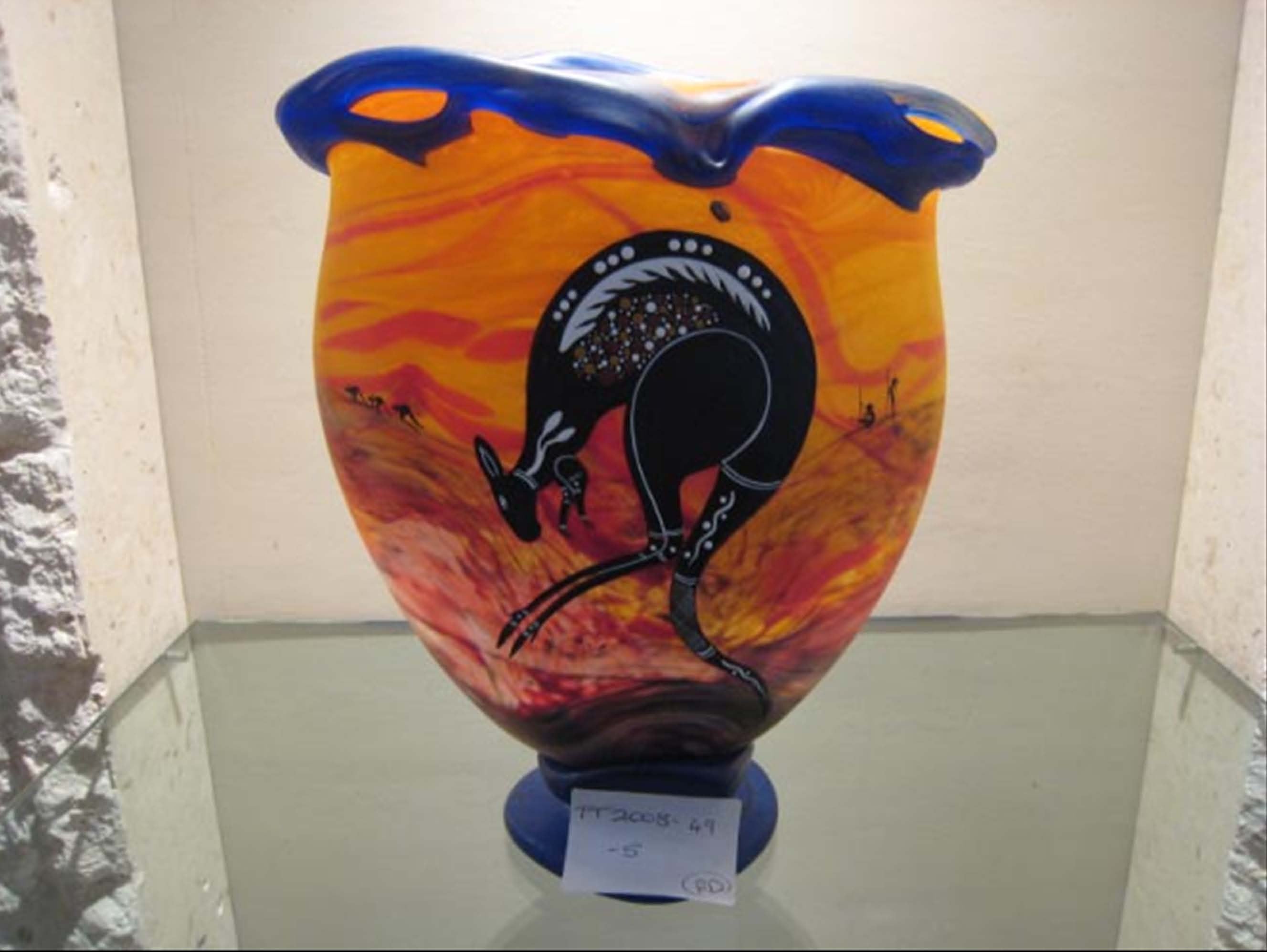 Tina often collaborates with indigenous artists on her glass work and this is no exception, with the beautiful and heavily stylised kangaroo serving as the focal point of the artwork.