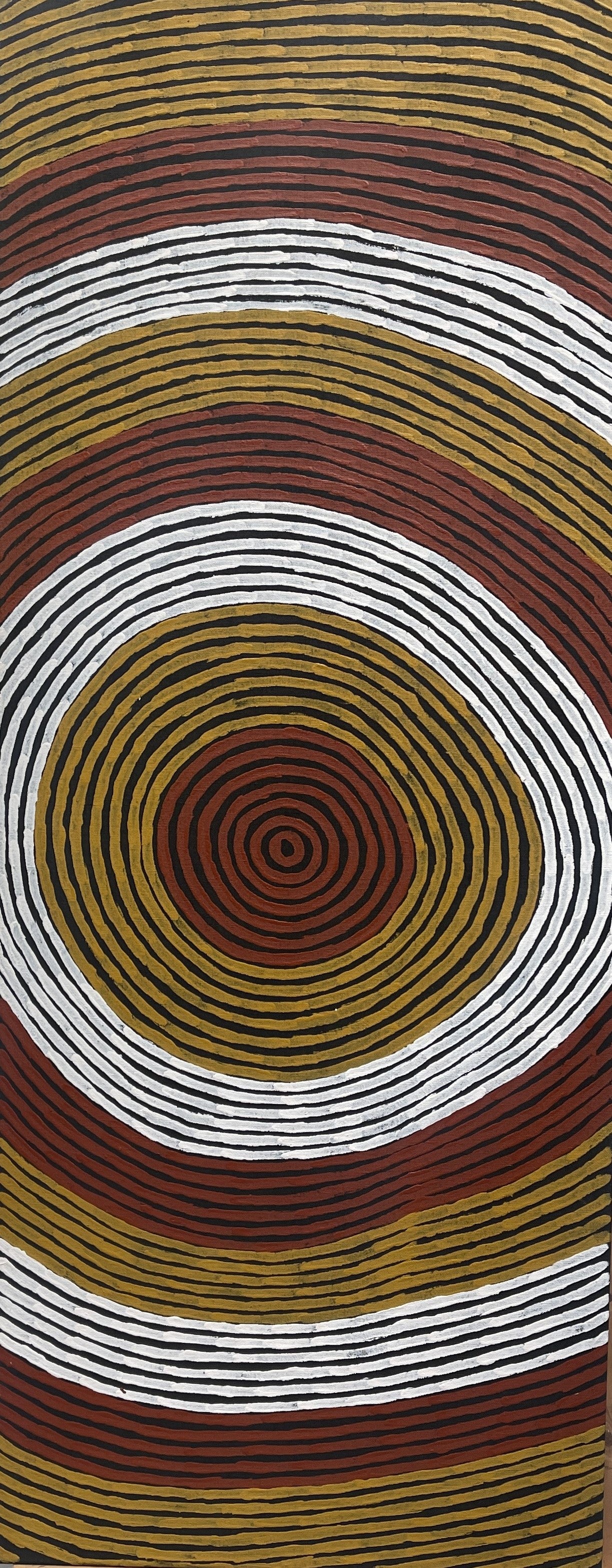 Albury David Jungala (Kumuna) is the son of the famous artist Ronnie Tjampitjinpa and lives in Kintore, NT. Like his father he paints Tingari, Water. Fire and Moon dreamings.