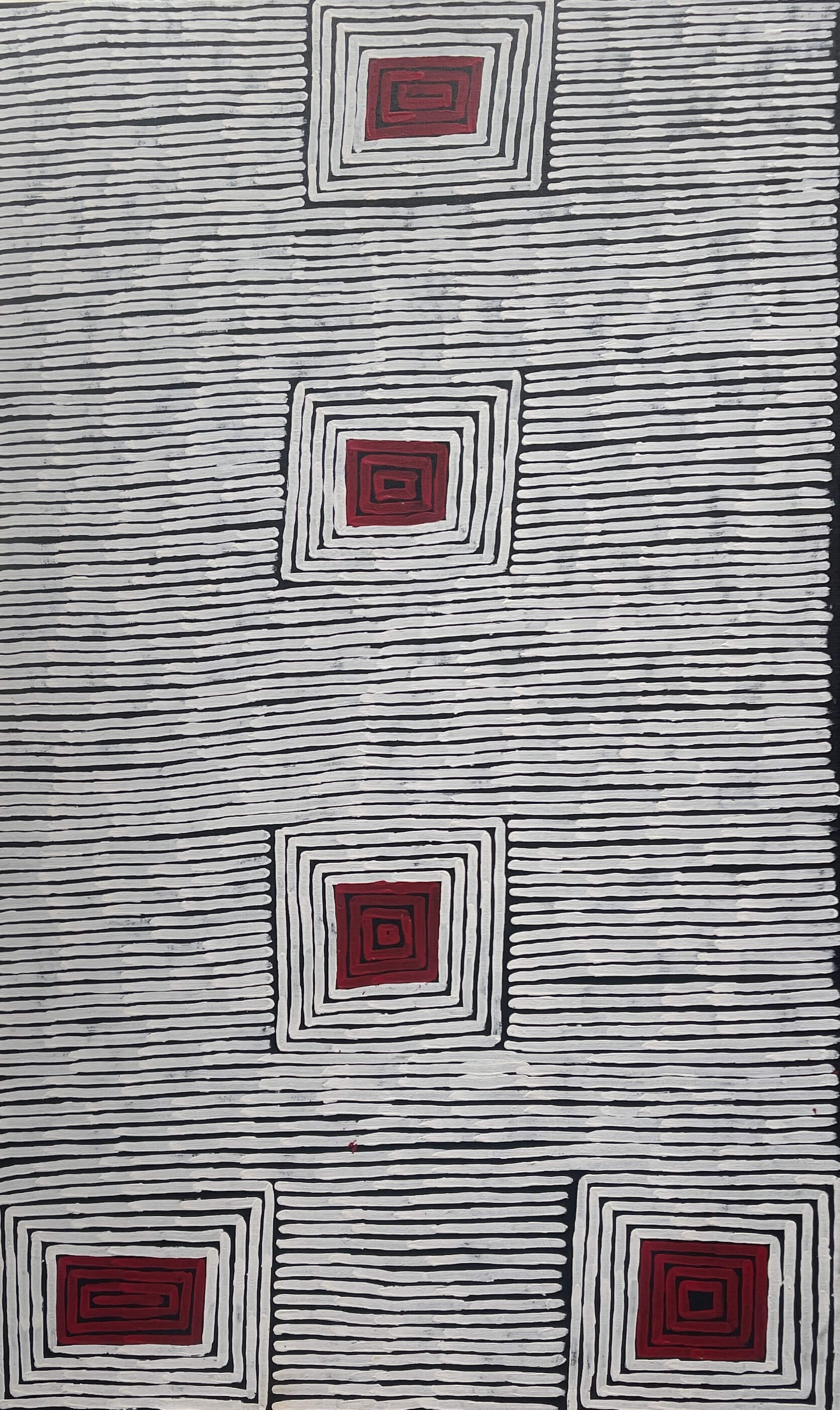 Albury David Jungala (Kumuna) is the son of the famous artist Ronnie Tjampitjinpa and lives in Kintore, NT. Like his father he paints Tingari, Water. Fire and Moon dreamings.