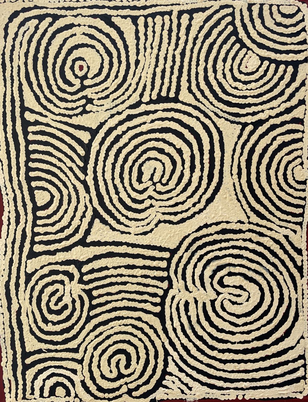 Esther Giles Nampitjinpa, sister of fellow artist Tjawina Porter Nampitjinpa and half sister of Nyurapayia Nampitjinpa (aka Mrs Bennett), lived in the bush with her family until her younger brother died, at which time they decided to move to the newly established settlement of Papunya.