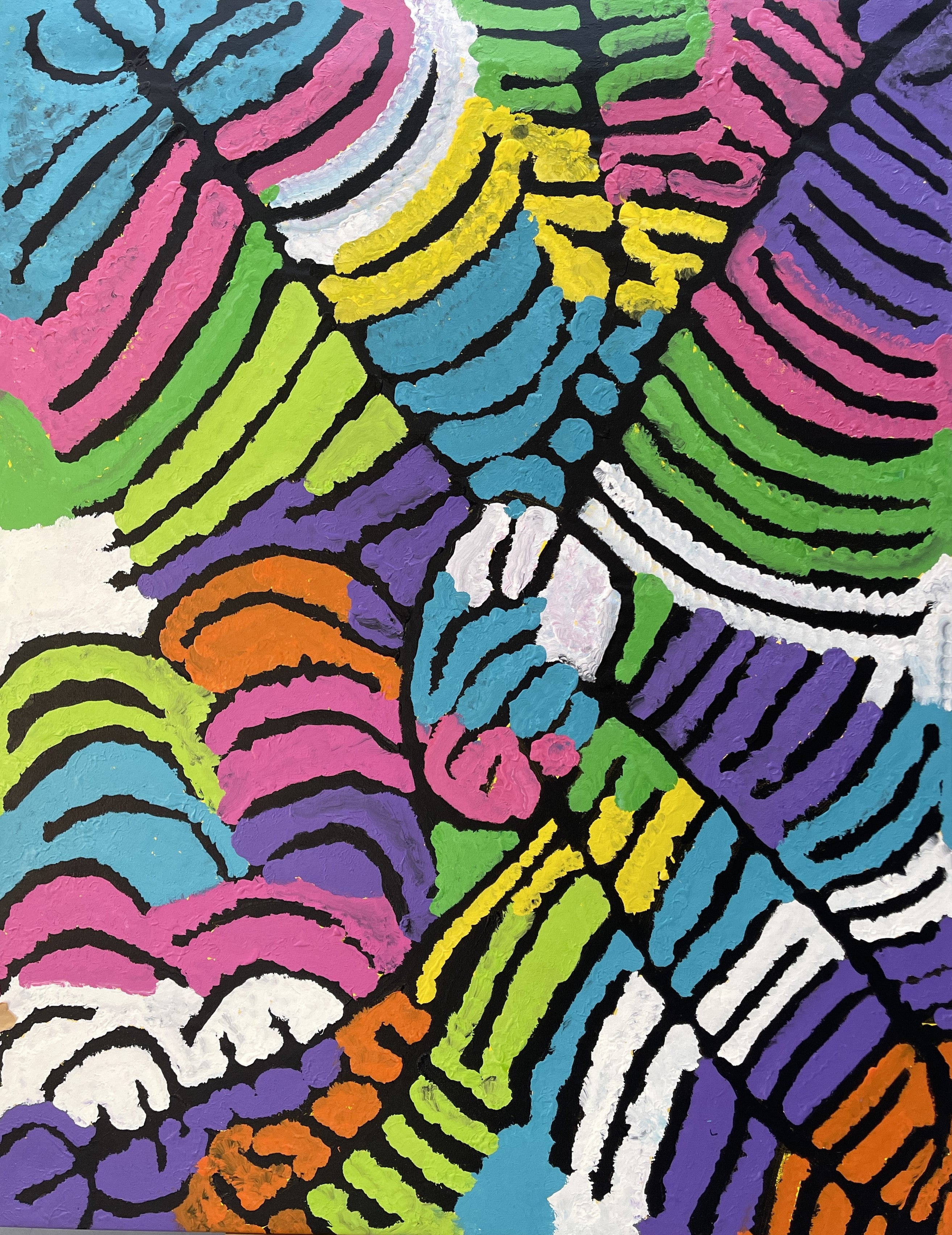 She began painting with a small group of women who collectively produced the first women's paintings for the Wanayaka Art Centre in Lajamanu. Her work depicts Dreamings of her country Yumurrpa, near the Granites in the Tanami Desert in the Northern Territory. With her unique and contemporary style using clashes of vibrant colour, Lorna paints her bush tucker Dreamtime stories; including bush potato and bush cabbage.