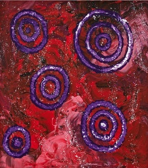 This story relates to a night sky narrative as seen from the desert near Papunya. The concentric circles are referred as both stars in the sky but also they represent the 'old people', in particular the first wave of artists at Papunya. These were the original art stars and Jagamara has painted them in both the 'classic' style (circle and dot) and his own 'abstracted' style with characteristic broad brush 'expressionist' splashes.