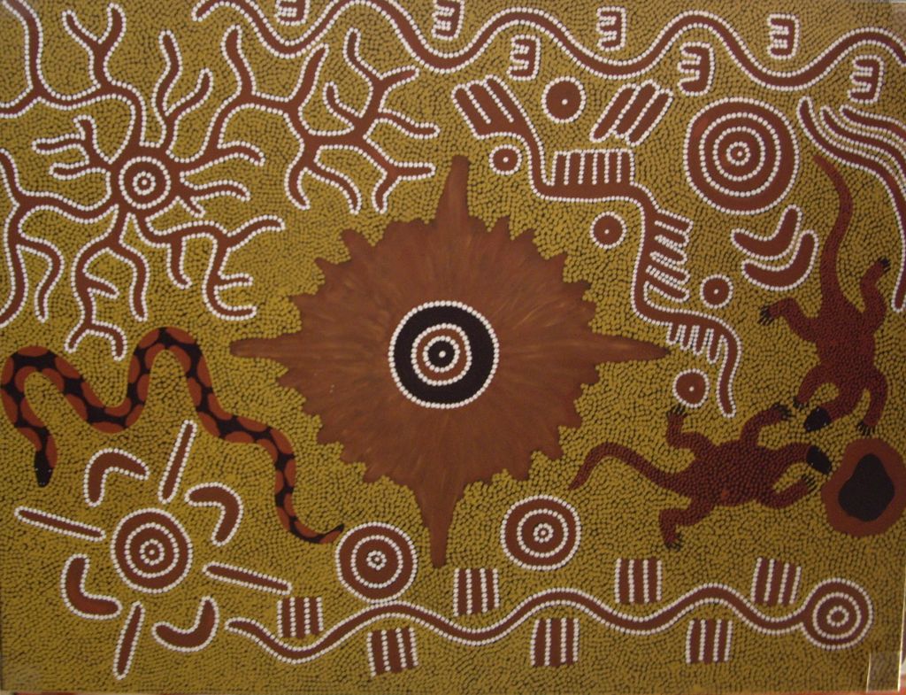 Old Man Lightning is from the site of Kunajarrayi, and is sacred men's business. The U shape is man sitting on the ground during ceremony with his Nulla Nulla (horizontal line) placed in front of him.