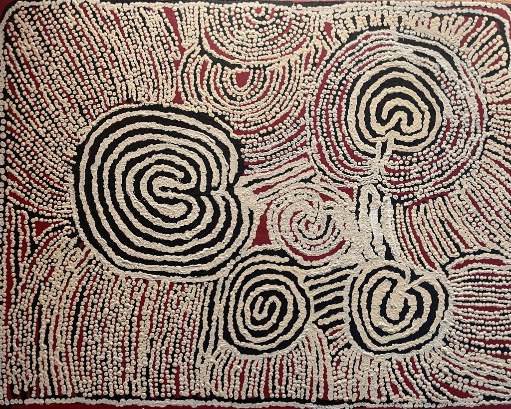 Esther Giles Nampitjinpa, sister of fellow artist Tjawina Porter Nampitjinpa and half sister of Nyurapayia Nampitjinpa (aka Mrs Bennett), lived in the bush with her family until her younger brother died, at which time they decided to move to the newly established settlement of Papunya.
