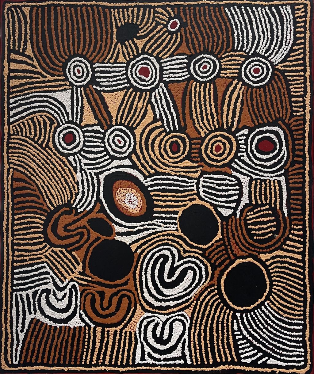 Esther Giles Nampitjinpa, sister of fellow artist Tjawina Porter Nampitjinpa and half sister of Nyurapayia Nampitjinpa (aka Mrs Bennett), lived in the bush with her family until her younger brother died, at which time they decided to move to the newly established settlement of Papunya.