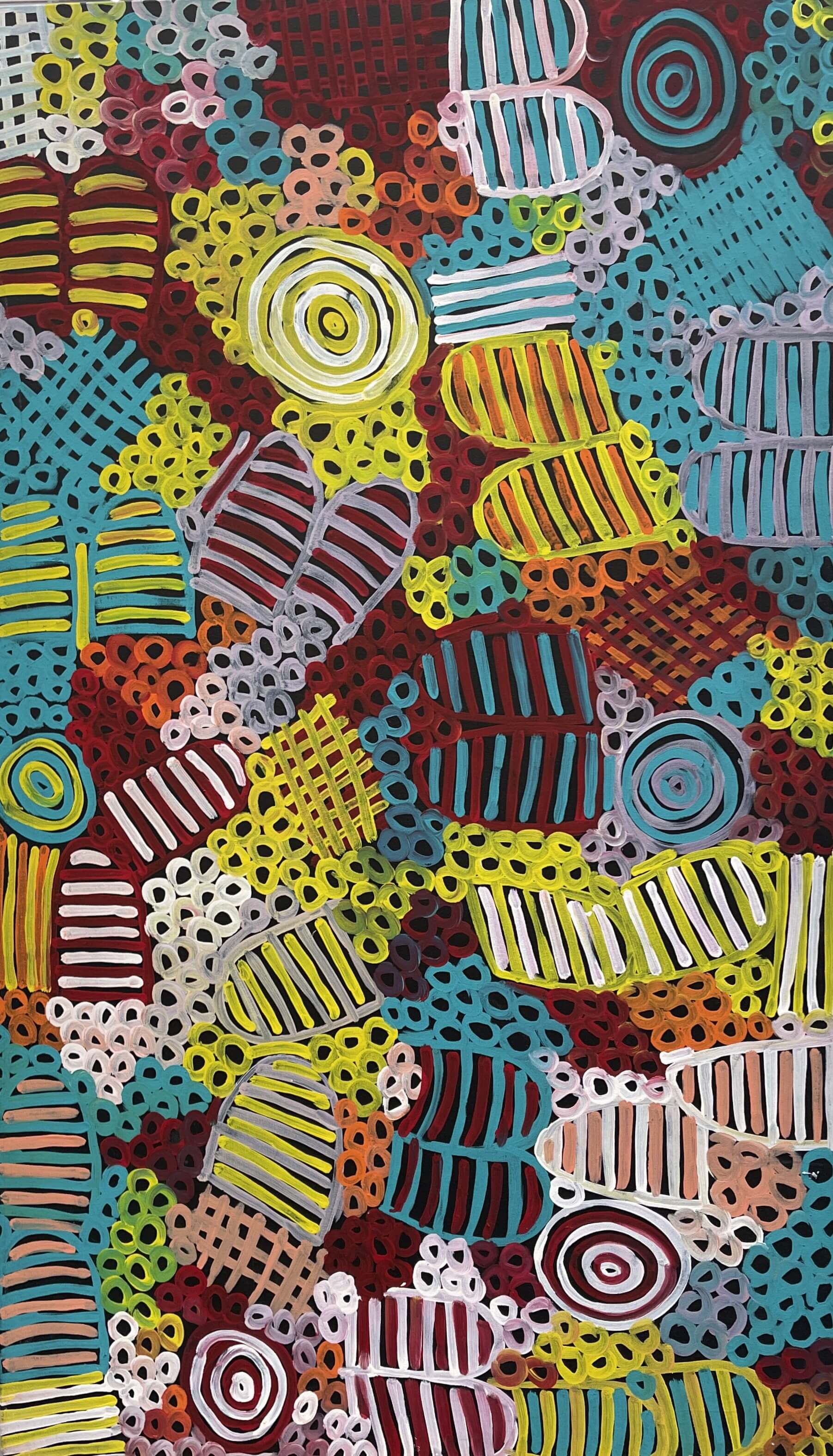 Betty was born into perhaps the most well respected and collectible artistic families in contemporary Aboriginal art. Her late mother, Minnie Pwerle and her sister Barbara Weir are highly collectable and influential artists in Australia. Betty's work is has memories of her mother's style having apprenticed under Minnie before her passing. Betty creates organised chaos with shapes and iconography that at once create a strong sense of cultural importance and aesthetic impact. Her work is vivid, colourful, energetic and very feminine.