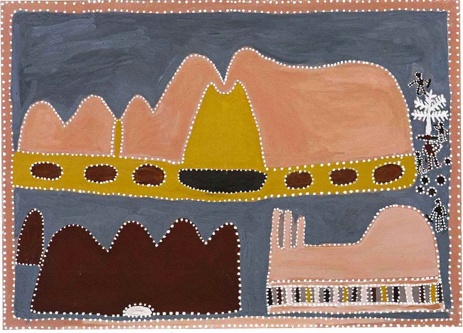 This stunning piece is a landscape depicting the Wirdin and Doolngayim country and like much of her work is composed of the surrounding mountains and landmarks of the area.
