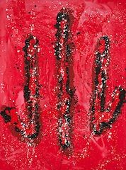 The central line represents the distinctive track made in the sand by the kangaroo's tail, with the hind legs either side. Traditionally, Kangaroo ancestors angered Warnayarra (The Rainbow Snake) at Mawarriji, a sacred site near Mt Singleton. They tried to punish the Kangaroo Men with a ferocious storm of wind, rain, and lightning. The Kangaroo Men hid in a cave for several days and waited for the storm to pass.