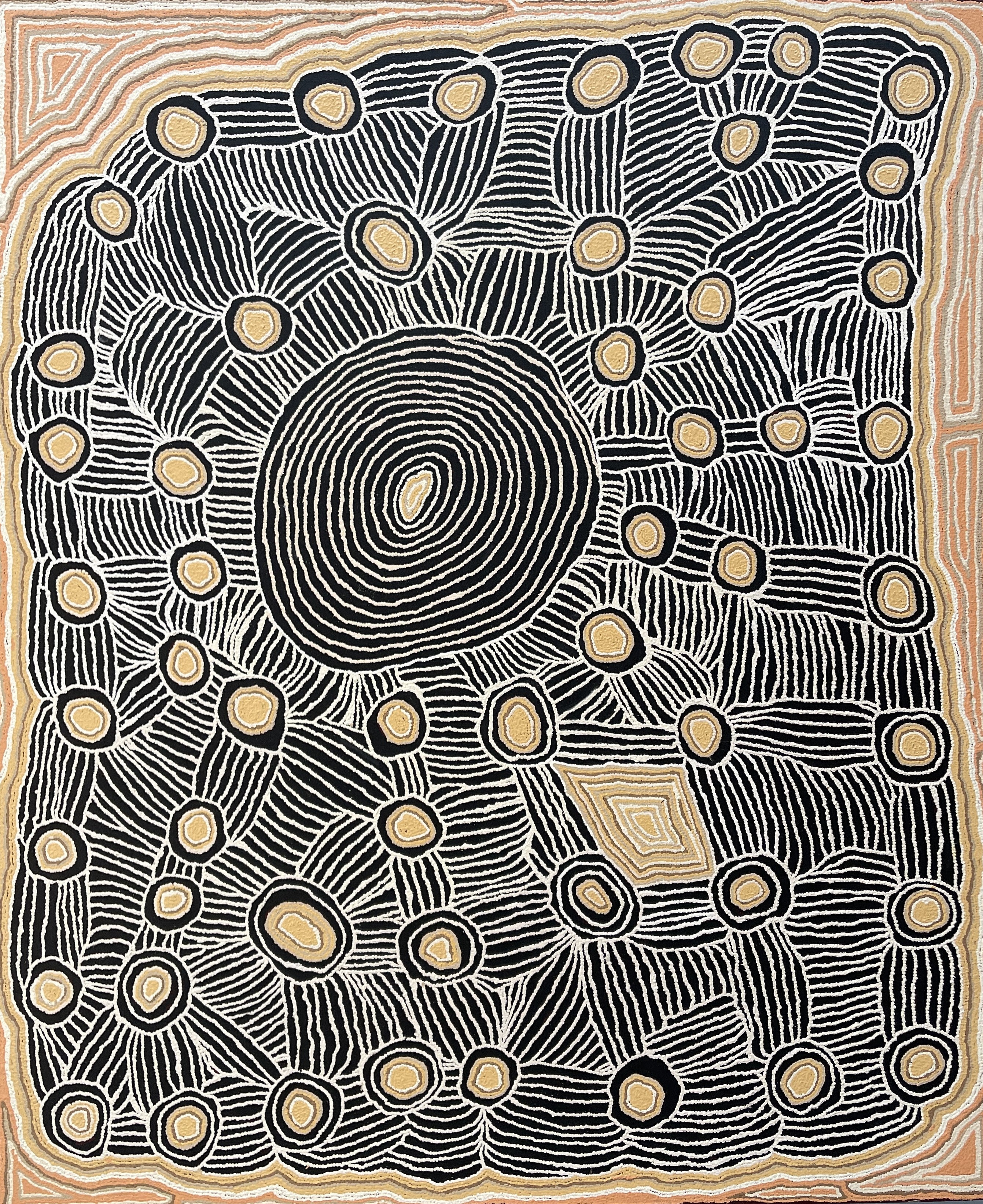 Linda and her family walked out of the desert in the 1940's to Haasts Bluff where she was educated by Lutheran Missionaries. In conjunction with with the education she has received from original Papunya movement artists, Uta Uta Tjungala, Nosepeg Tjapurrula and Shorty Langkata Tjungarrayi, Linda has formed a distinctive unique style that combines her Christian and Aboriginal spiritual beliefs.