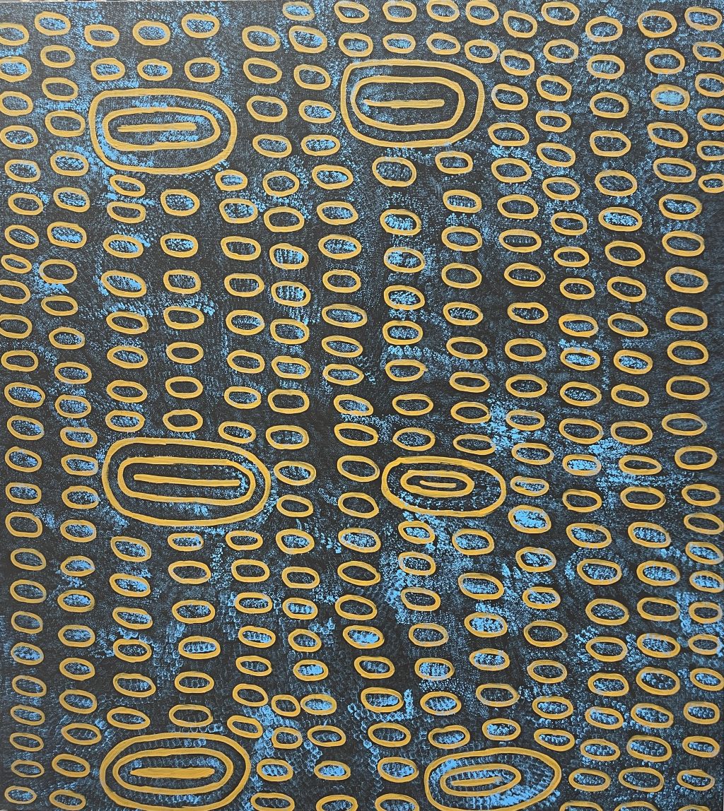 Ngoia took up painting in 1997 and painting stories associated with her father and brothers country. Through her distinctive designs she explores different representations of the swamps, lakes and spinifex country in these areas. In 2006 she was awarded with Aboriginal art‘s most prestigious award, The Telstra Art Award. She continues to produce beautifully crafted and evocative canvases of her Dreamings. She is represented in important private and public collections throughout the world.