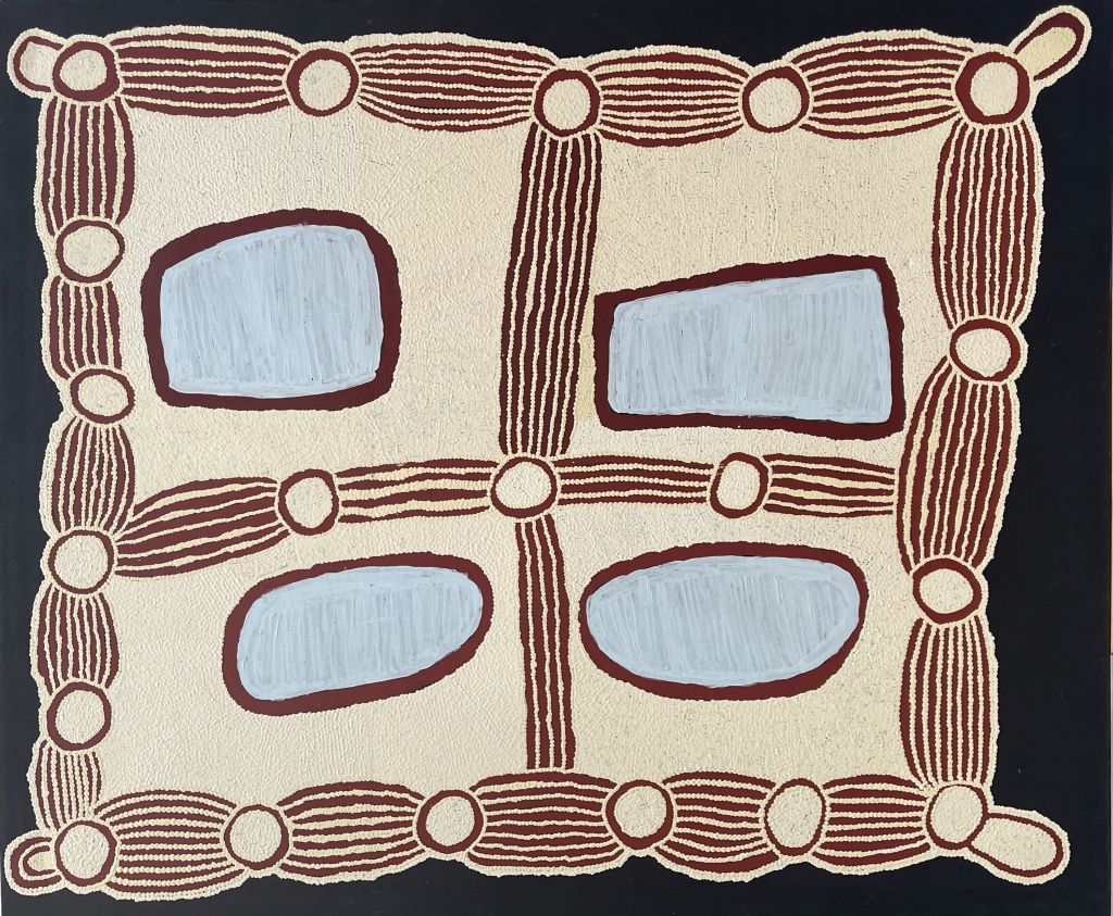 Her Dreamings include Tingari Dreamings, her father's Emu story & mother's Snake story which depict both mythological stories & actual events of traditional life in the desert.